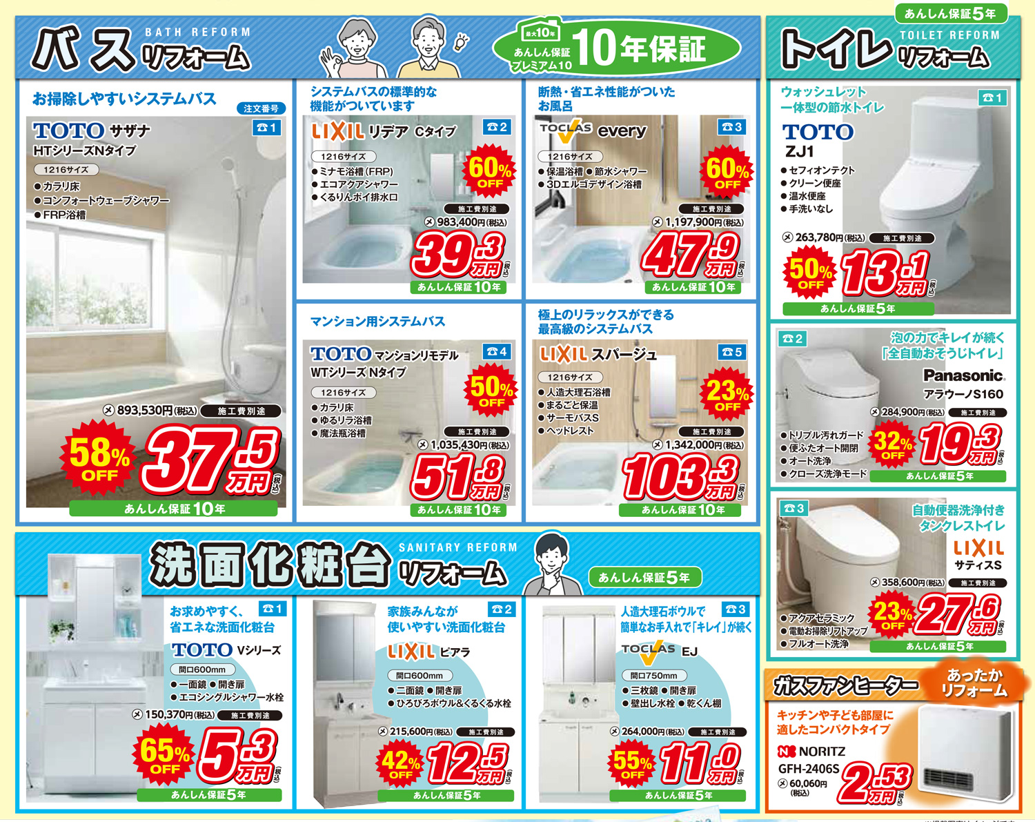 キッチン、バスルーム、トイレ、洗面化粧台など、水まわり設備について、TOTO、LIXIL、Panasonicといった人気メーカーの製品 が、割引価格 でお求めいただけます。